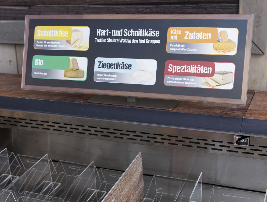 Wir zeigen Ihnen beispielhaft unsere ansprechende Warenpräsentation in einer gut sortierten Käsetheke. Diese unterstützt den Verbraucher bei der Orientierung und stimuliert so den Verkauf Ihres Käses.